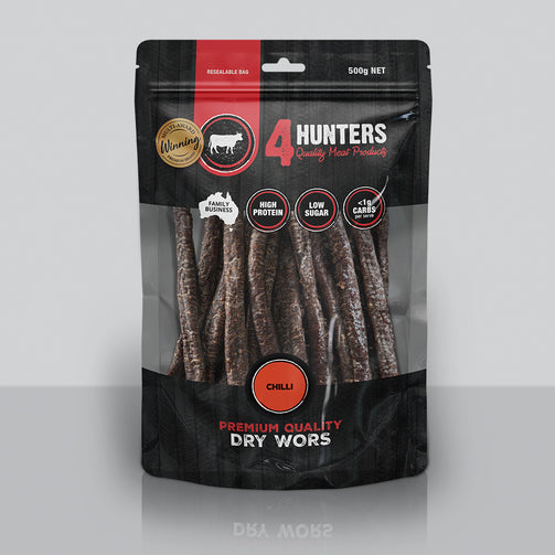 ( 4 x 500g Bags ) Our Chilli Dry Wors is simply amazing. The combination of HOT chilli and beef teases the tastebuds. With the heat of the chilli being HOT, but packed full of flavour, this one is great for the whole family!