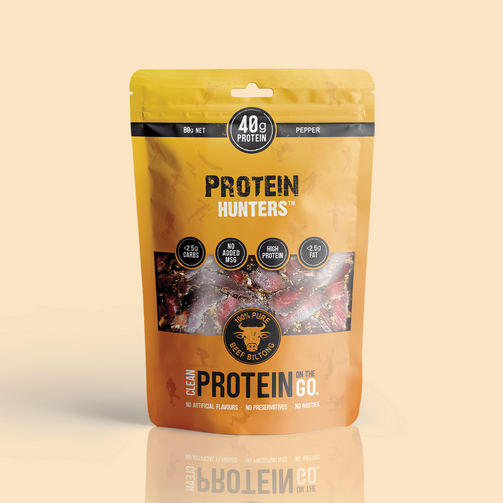 Our Pepper 80g Bag of Natural Beef Protein, has a bit more heat. A subtle blend of beef and cracked black pepper delivers a unique, spicy combination.